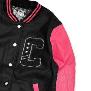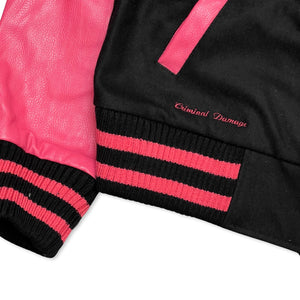 Womens Criminal Damage Varsity jacket in black and pink