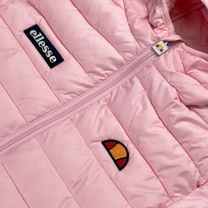 Women's Deadstock ellesse Lompard padded puffer jacket in light pink. Embroidered ellesse branding. Zip pockets to front on both sides. Elastic waist. Chin guard to full zip closure.