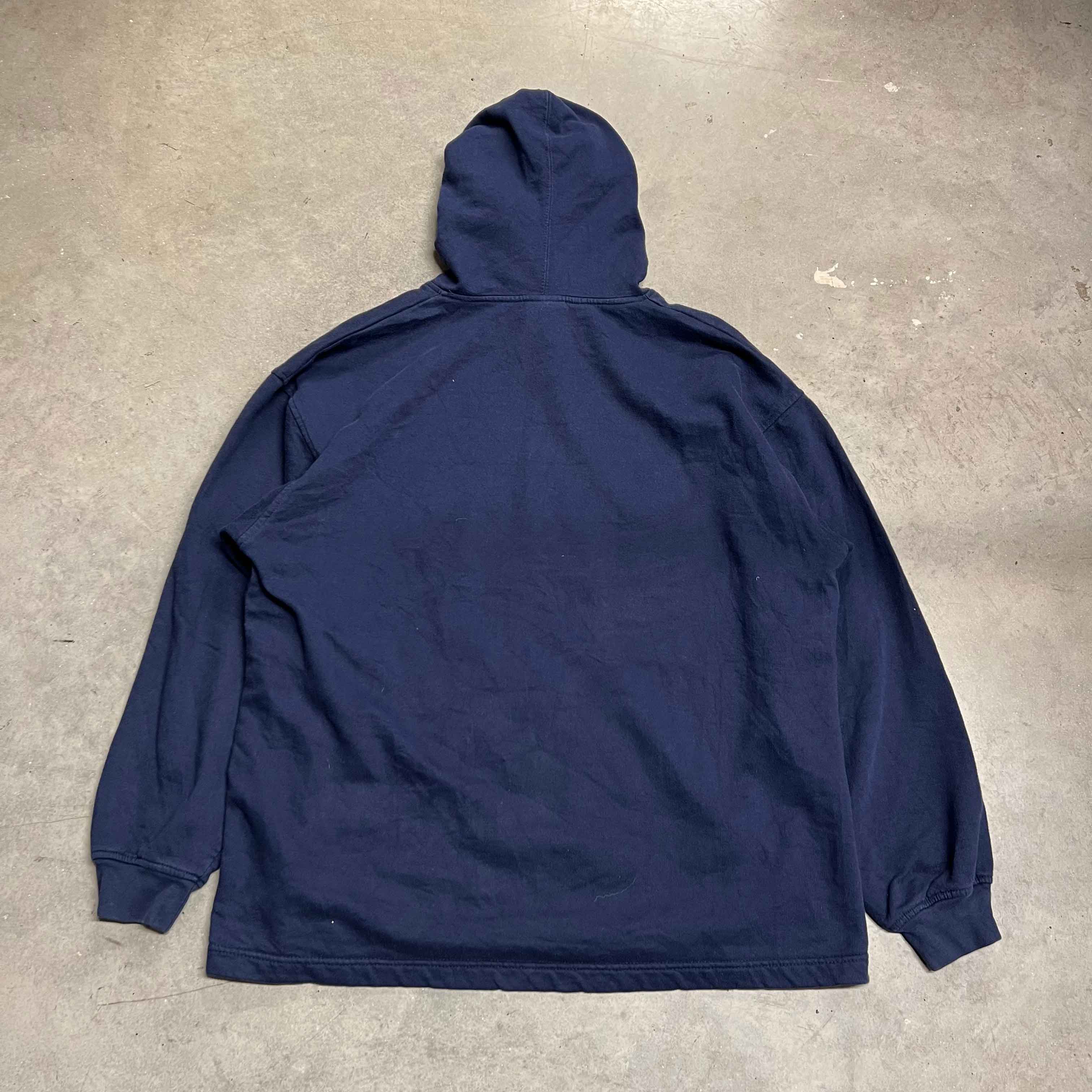 Vintage NFL Broncos hoodie in navy blue with spellout across chest.