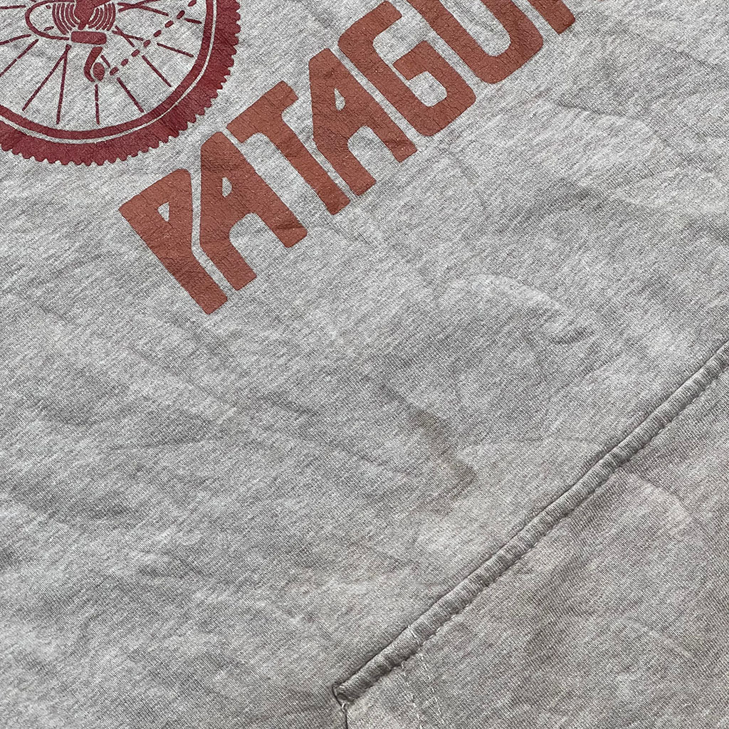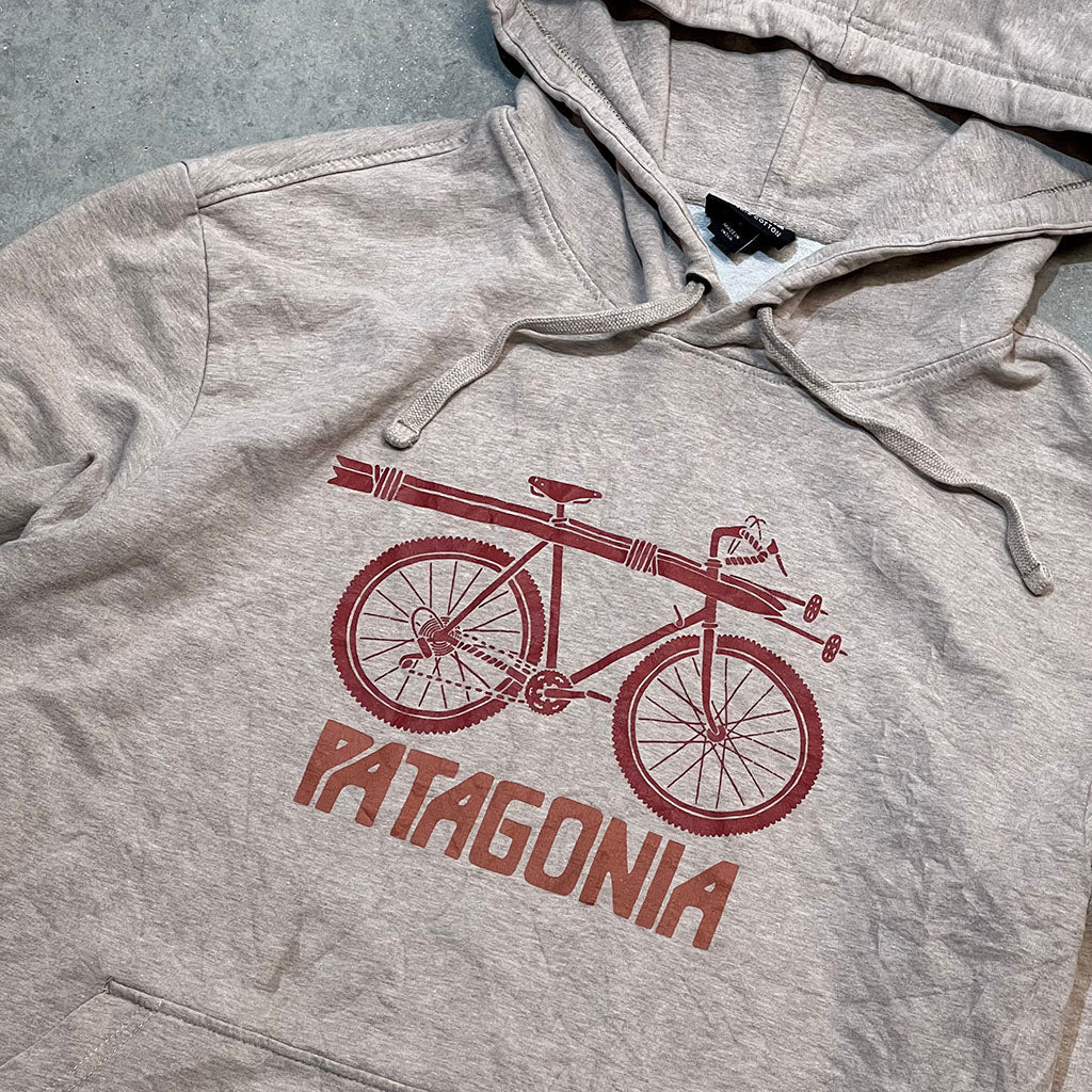 Vintage Patagonia hoodie in beige with bicycle graphic and spellout.