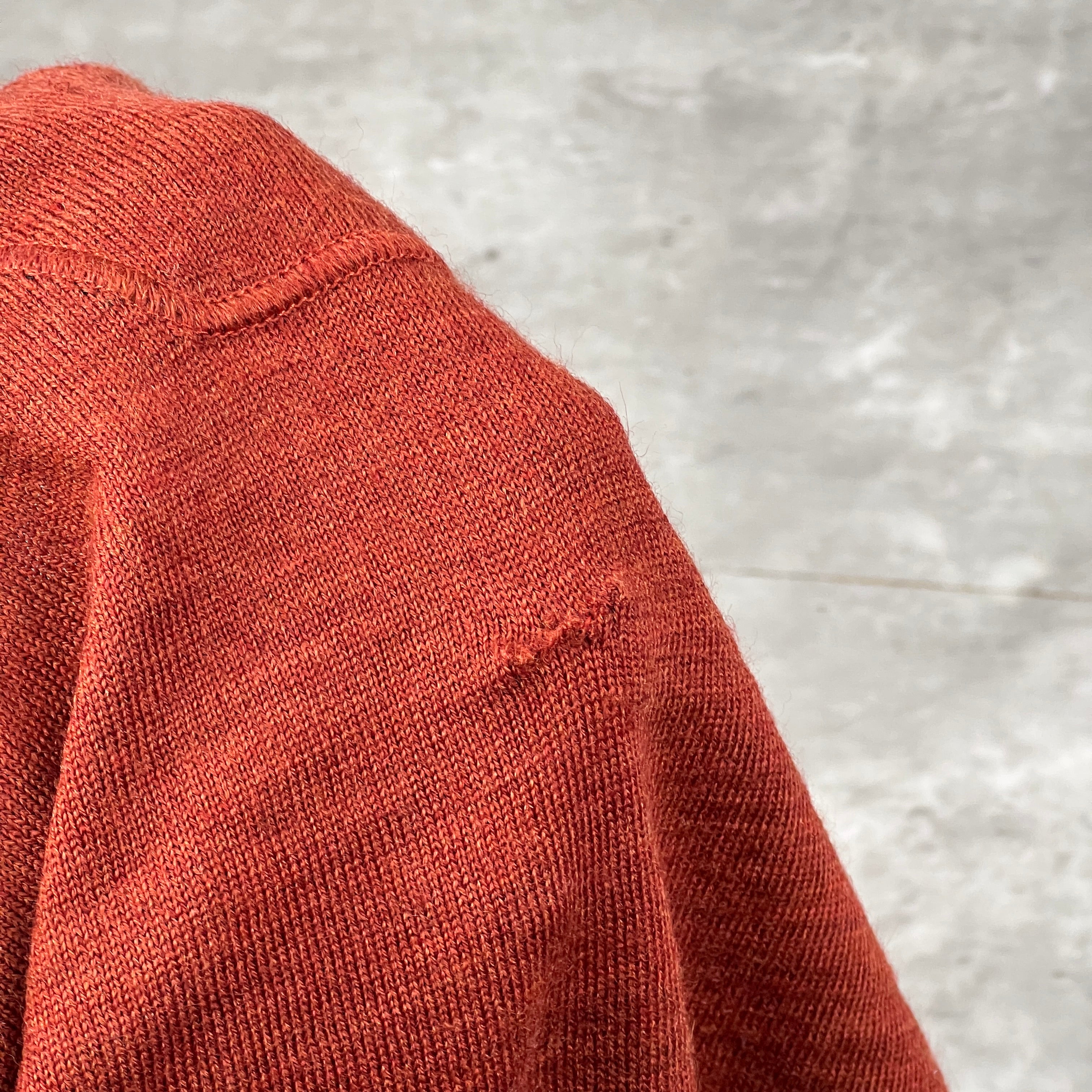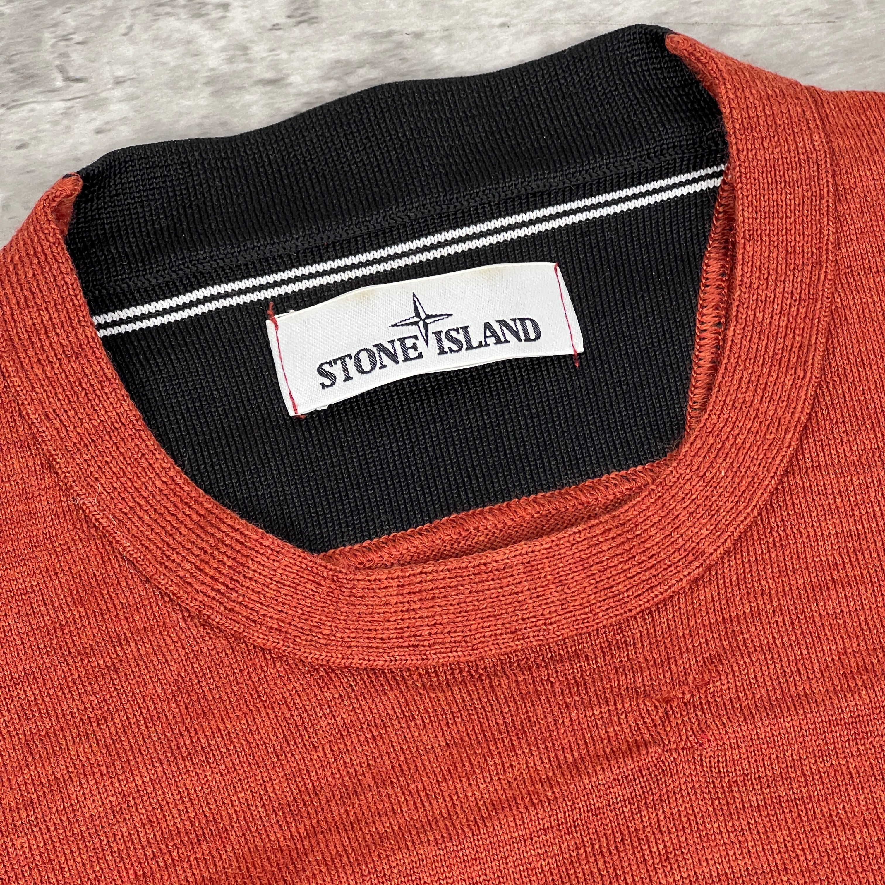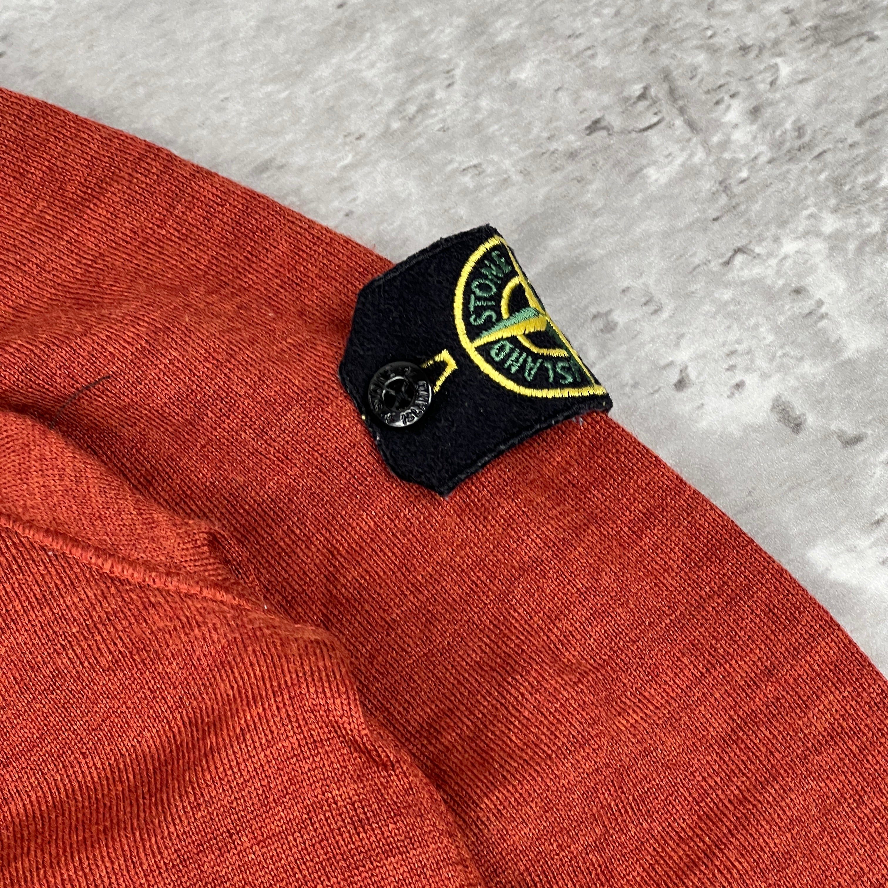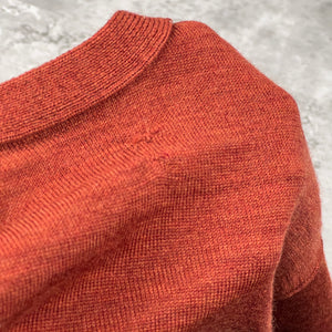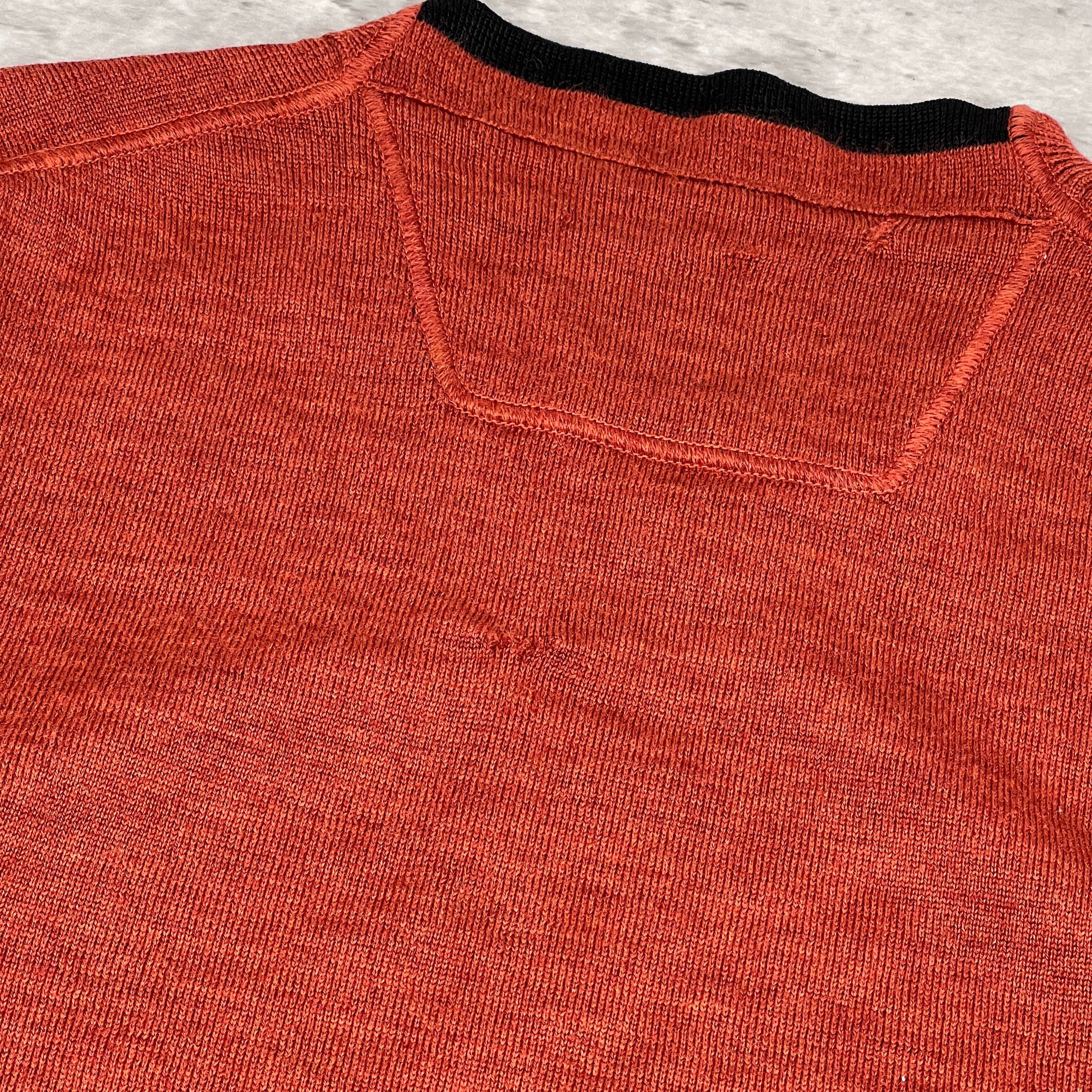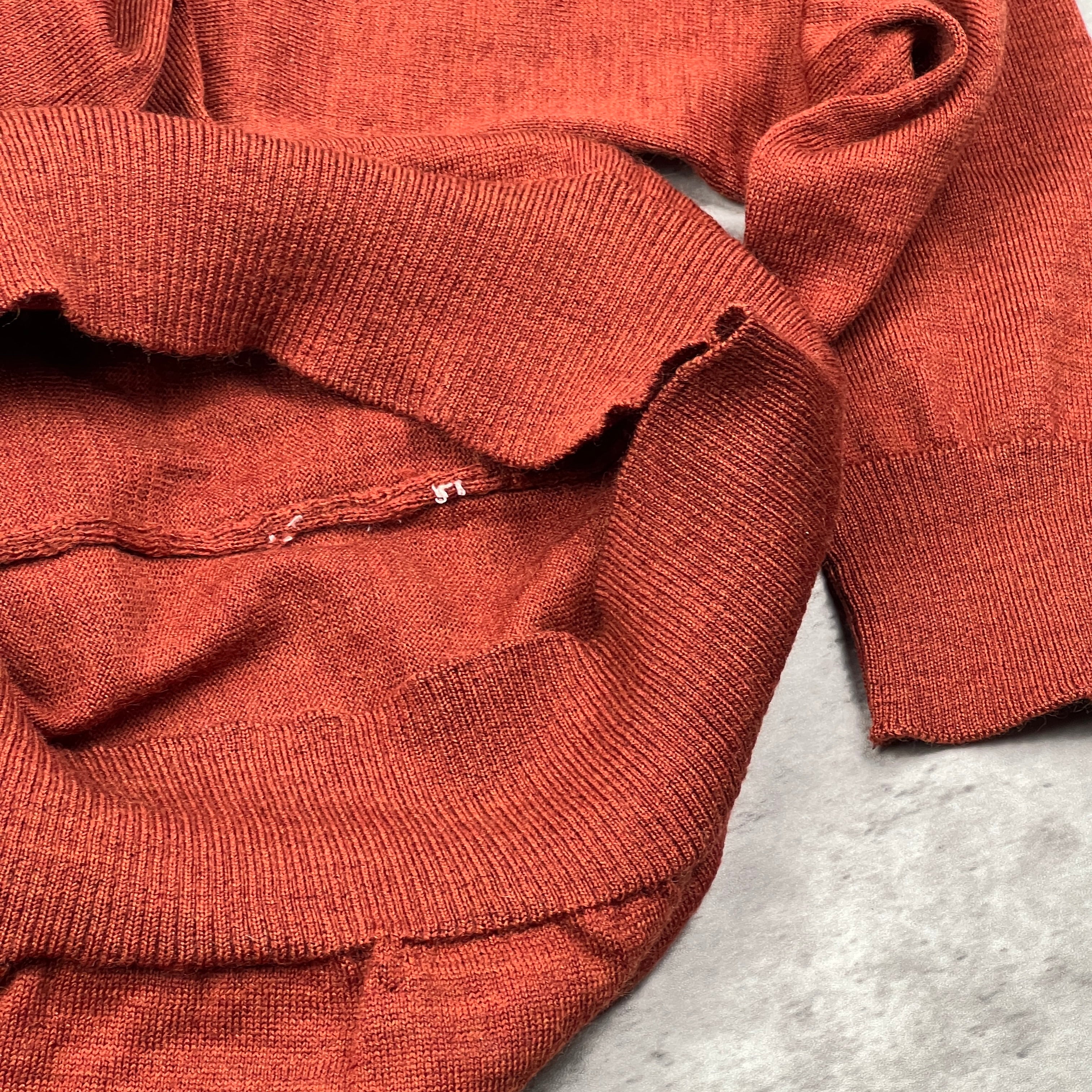 striking Autumn/Winter essential in a vibrant burnt orange/rust colorway. This lightweight wool-blend knit features a dual-layer aesthetic with a black contrast internal collar for added structure. Complete with the iconic detachable compass badge on the left arm. Please note this is an archive piece with some professional-grade repairs as detailed below.