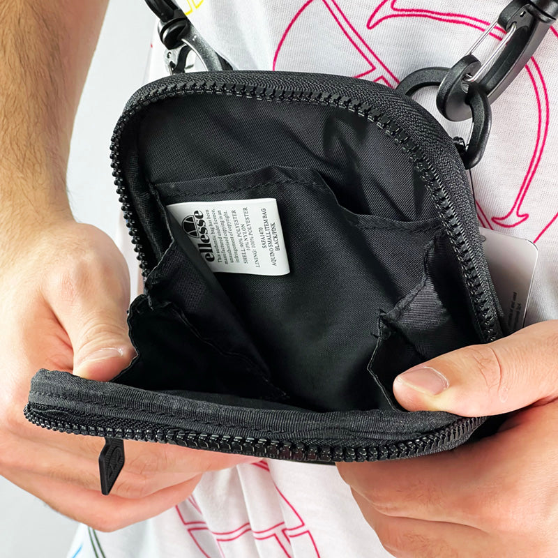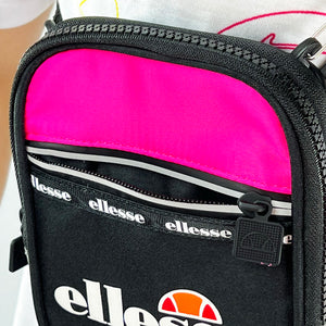 Ellesse Aquino small cross body bag in black and pink. Reflective strip to zip. The perfect way to style up any outfit, this crossbody bag has an all the way zip compartment. Logo across front.
