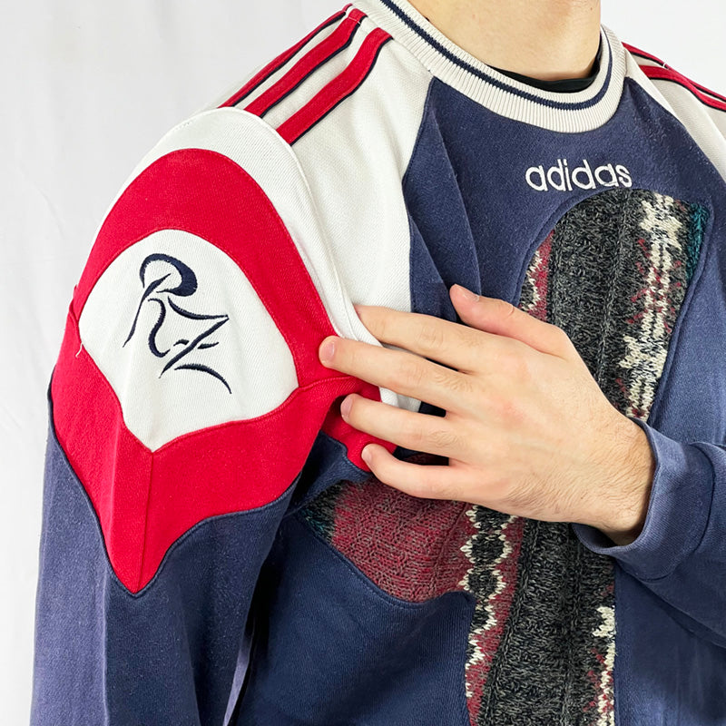 COOGI-style navy sweatshirt. Step into the '90s style with this unique REWORK Adidas x COOGI Sweatshirt. Perfectly tailored with stripes, this statement piece is an ideal way to make a style statement. Comfortably cozy and timelessly stylish, make this sweat your go-to for a modern twist on retro fashion!