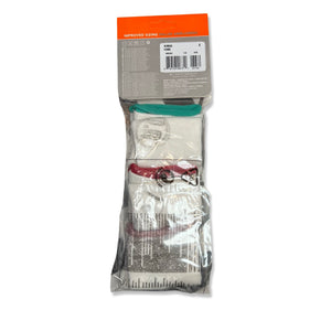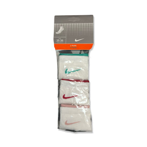 3 Per Pack Y2k Women's Deadstock Vintage Nike Sports Socks in White. Socks has 3 different coloured Nike Swoosh. Green swoosh, hot pink swoosh and pink swoosh